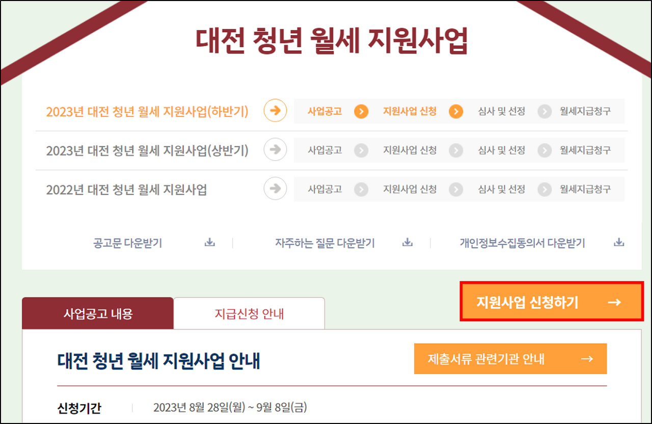 대전 청년 월세지원 사업 지급 방법은 선정이 된 대상자는 월세를 먼저 납부 후에 납부내역을 확인하여 월별 신청인 계좌로 지급이 됩니다. 지원금 지급 신청은 매월 1일에서 5일까지 홈페이지에서 지난달 지원금을 신청할 수 있습니다. 기한 안에 신청을 하지 않는 경우에는 월세 지원금은 다음 달까지만 소급 지원 신청이 가능합니다. 예를 들어 11월 지급 신청 기간 안에 10월 월세 지원금을 신청하지 않았다면, 12월 지급 신청 기한까지만 신청이 가능합니다.