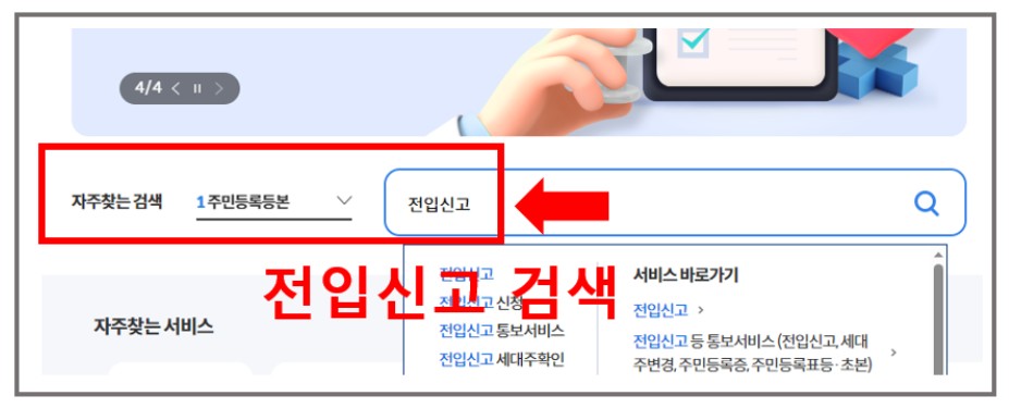 2. 검색창에 " 전입신고 "라고 검색하고 " 신청서비스"에서 <전입신고>를 누릅니다.