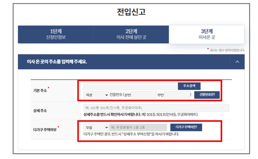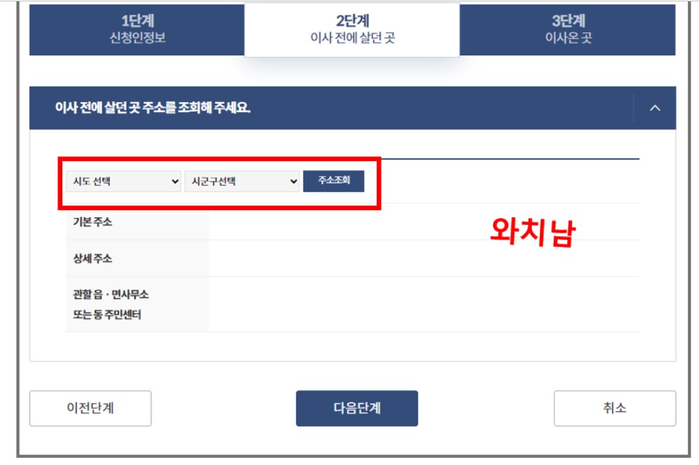 4. 이전 거주지 주소를 조회한 후 이사하는 곳의 정보를 입력합니다.