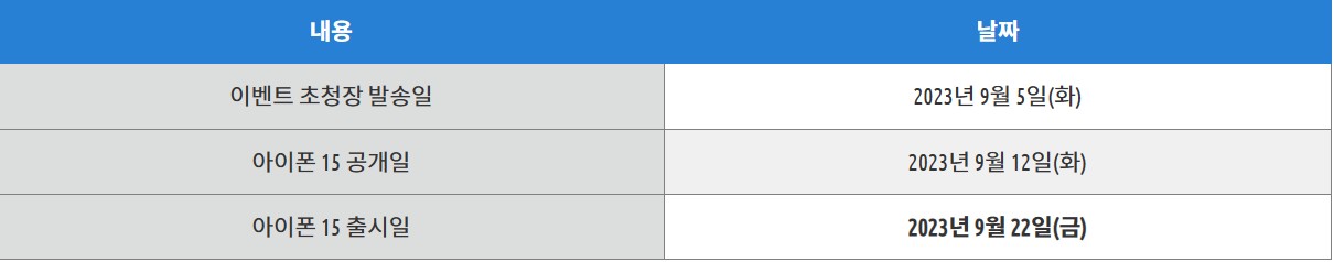 곧 출시되는 iPhone 15 예상 출시일 및 가격정보에 대해 표와 사진을 통해 구체적으로 알려드리겠습니다. 꿀 정보 받아가시고 예약 및 구매하시는 데에 큰 도움이 되실 기원 합니다.